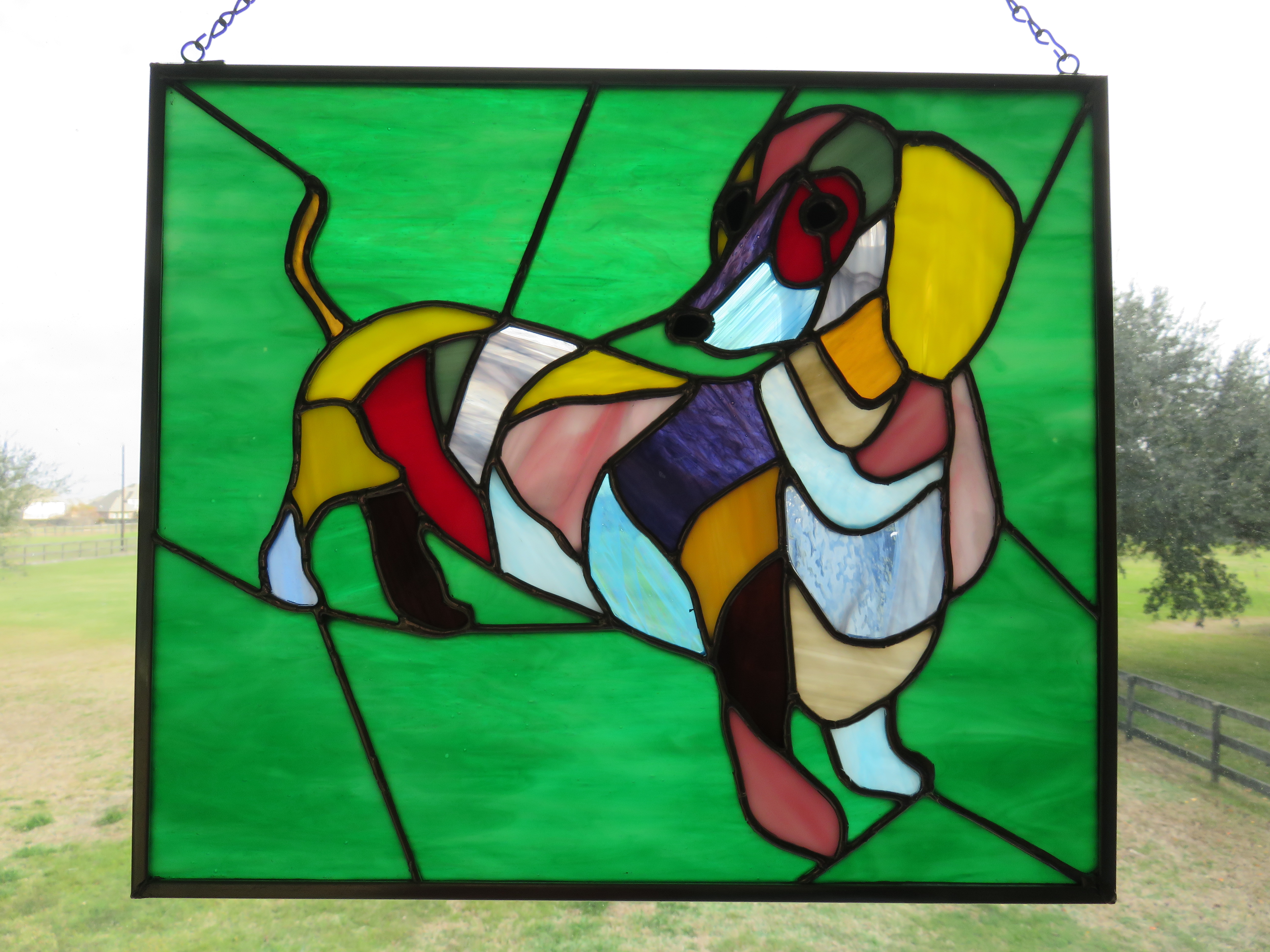 (Tom doesn't want to be left out since he made stained glass with the same pattern and colors.)